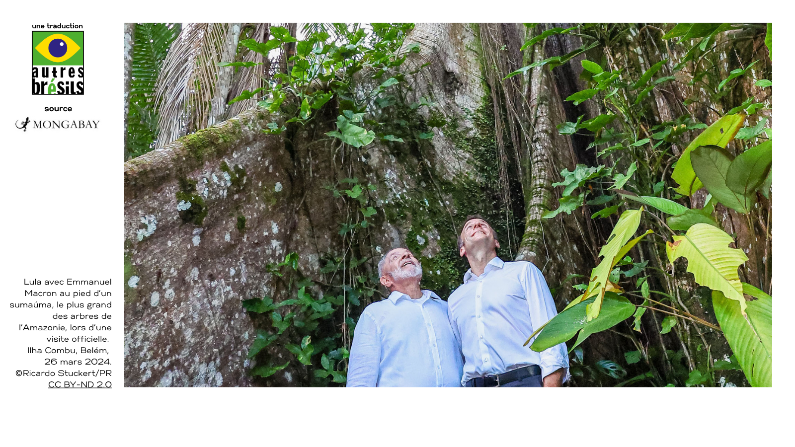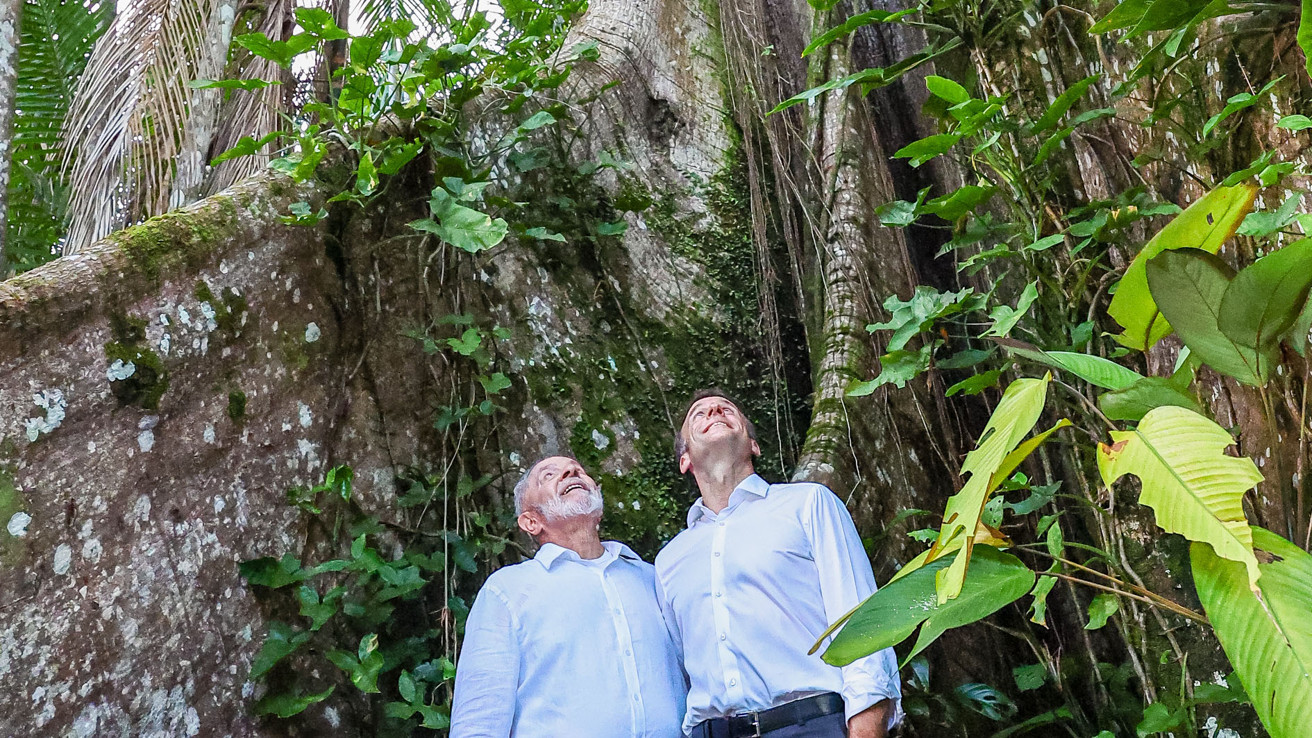 Lula avec Emmanuel Macron au pied d’un sumaúma, le plus grand des arbres de l’Amazonie, lors d’une visite officielle à l’Ilha Combu, Belém, 26 mars 2024. ©Ricardo Stuckert/PR CC BY-ND 2.0